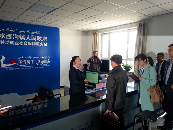 (图为参观乌鲁木齐县水西沟镇南河路社区经办服务平台)