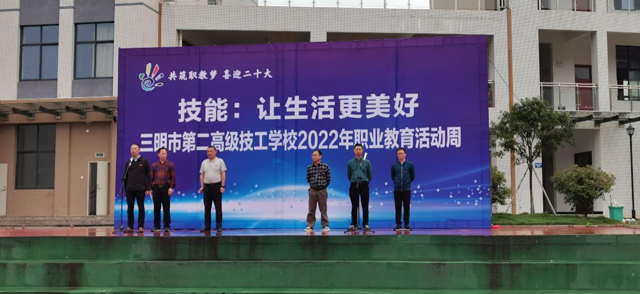 为贯彻落实全国职业教育大会精神,大力宣传劳模精神、劳动精神、工匠精神,弘扬“劳动光荣、技能宝贵、创造伟大”的时代风尚,5月12日上午,三明市第二高级技工学校在操场举行以“技能:让生活更美好”为主题的2022年职业教育活动周启动仪式。启动仪式由校党委委员、副校长陈昌初主持,党委委员、副校长林国坤传达了国家职业教育的相关政策,党委副书记、副校长章鹏飞致开幕词,最后由校党委书记、校长徐思明宣布2022年职业教育活动周正式开幕。