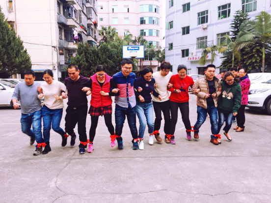 活动具体分集体跳绳、企鹅漫步、投篮接力、齐心协力等趣味项目,大家自由组合,积极应战。看集体跳绳这边,男同志使出浑身解数,卖力挥舞大麻绳,女同志异口同声数拍子,跳得热火朝天;企鹅漫步实际上就是夹球接力,最考验身体协调性,按照规则女同志夹球跳、男同志夹球走,大家也顾不得动作滑稽,只是全心投入,场上欢笑不断;投篮接力那边,女同胞们毫不示弱,个个煞有介事、精准发力,引来掌声阵阵;大场面还要数“齐心协力”环节,大家用红布条把腿两两扎在一起,手挽着手,高喊口令,真是心往一处想、劲往一处使,把全场活动推向高潮。