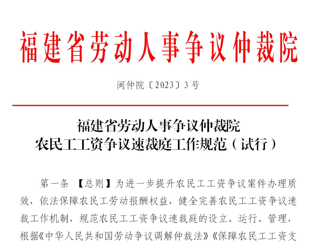 近日,福建省劳动人事争议仲裁院制定出台了《农民工工资争议速裁庭工作规范》(以下简称《工作规范》),首次明确了农民工工资争议从受理到调处到监督到执行各环节的工作规范,使速裁庭的工作职责更加清晰、权责更加明确、办案更加有序高效,从而化解农民工讨薪之忧,让农民工吃上定“薪”丸。