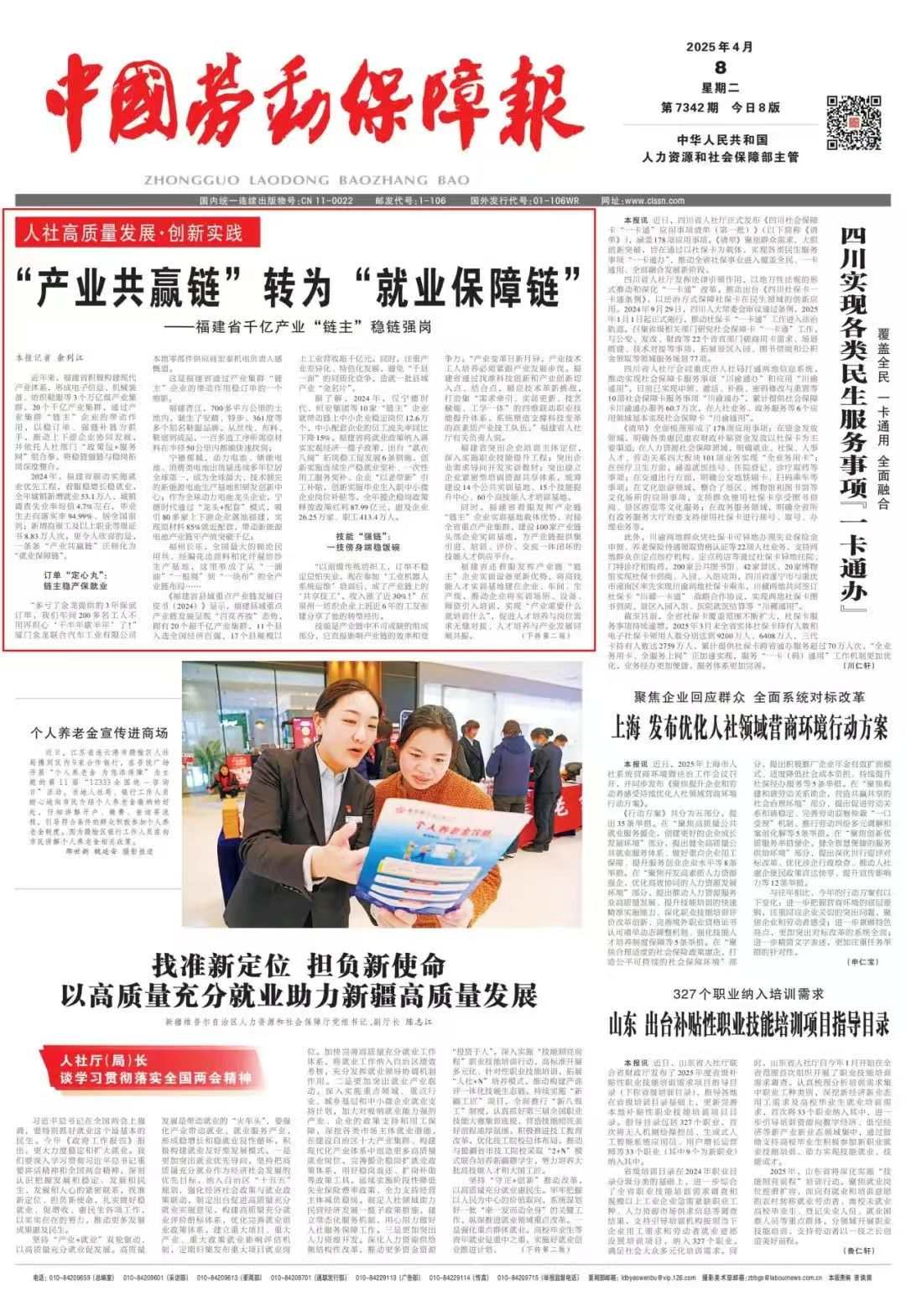 4月8日,《中国劳动保障报》头版关注福建。