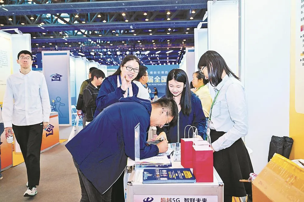 全国博士后创新创业大赛的赛场内,刚结束项目路演的博士后还带着比赛答辩的热乎劲儿,转身就涌进了对面的“人才招聘区”。