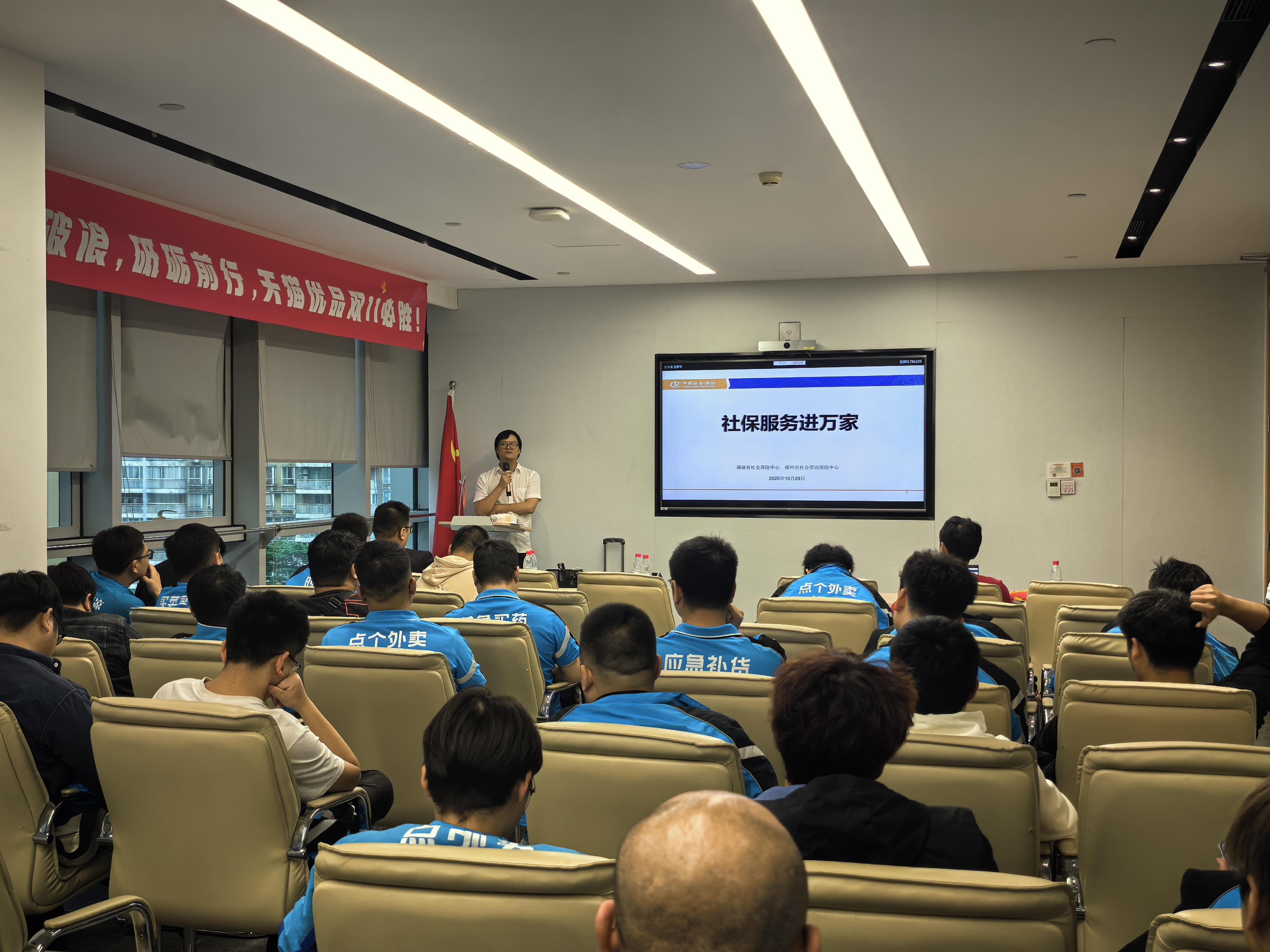 福建省社保中心、福州市社保中心联合组建的政策宣讲团队走进阿里巴巴旗下饿了么公司,为饿了么外卖骑手讲解职业伤害保障、灵活就业参保等政策及社保规划服务。
