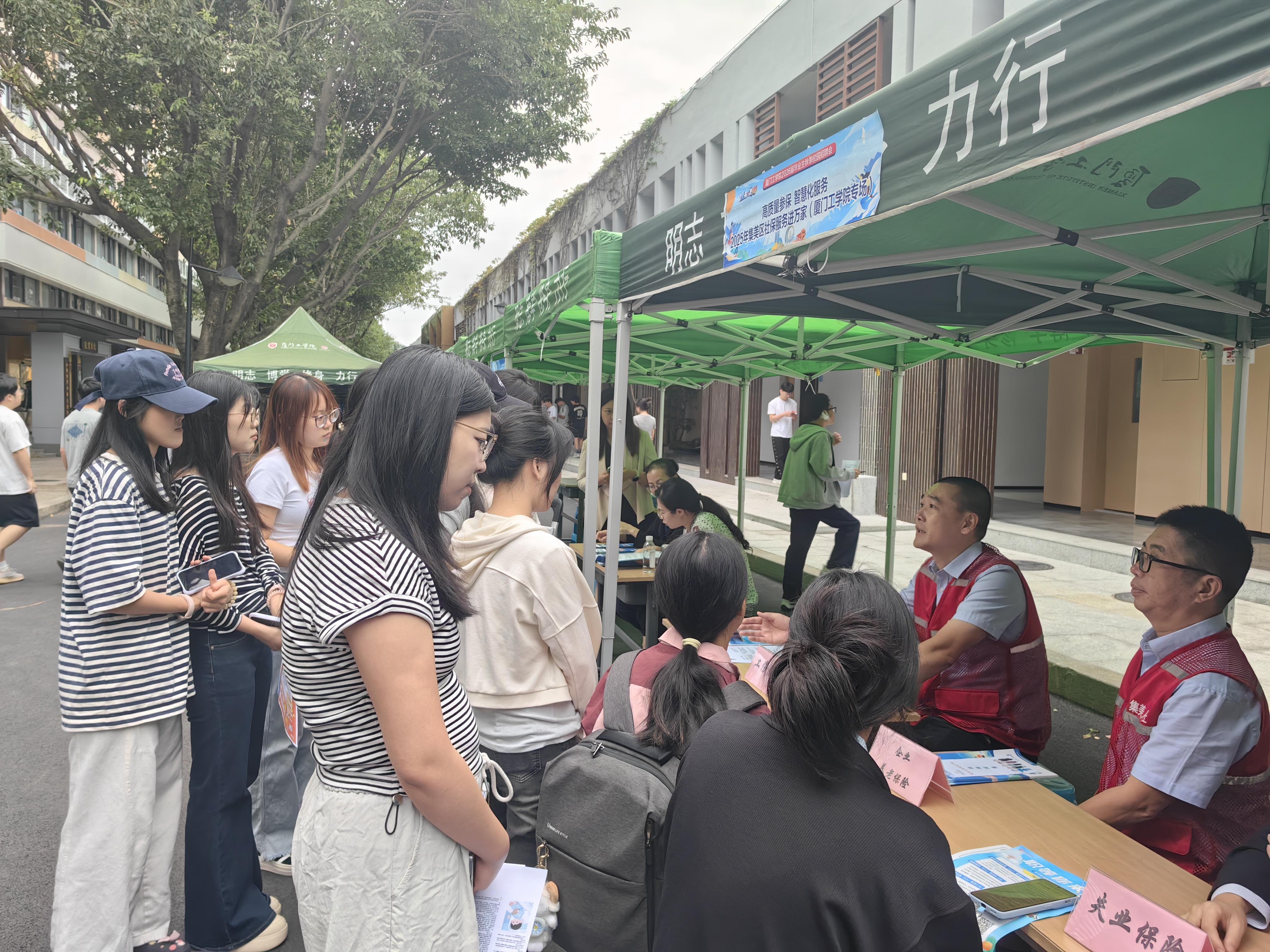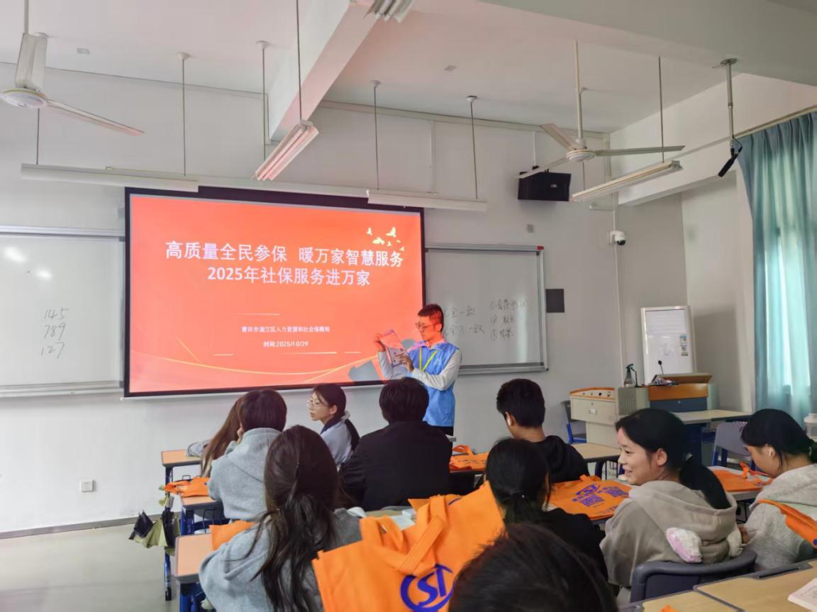 厦门市集美区社保经办机构走进厦门工学院,为即将就业的大学生讲解社保政策,积极推广“人社小智”等在线AI政策解答平台。