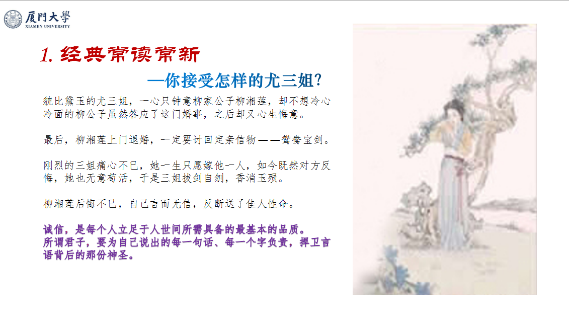 文学经典是中华优秀传统文化的重要载体,它传承文化基因。李菁副教授围绕经典名著《红楼梦》中“尤三姐悔婚后被柳湘莲退婚后而自刎”的故事,以图文并茂,辅以精选短视频的形式,深入浅出地讲述诚信的重要意义,让每个人都知道要为自己说出的每一句话、每一个字负责,捍卫言语背后的那份神圣。