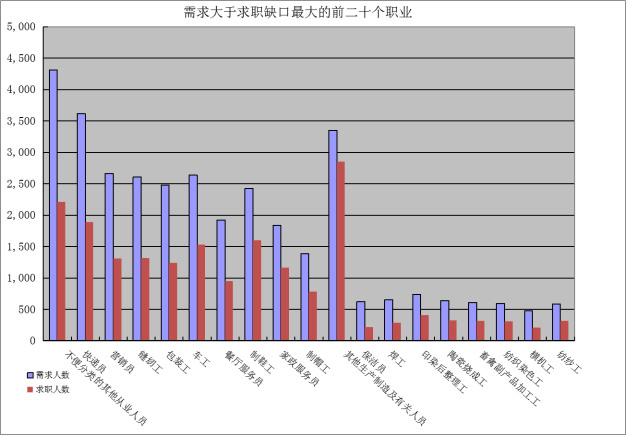 一是求大于供岗位(工种):不便分类的其他从业人员”、“快递员”、“营销员”企业需求缺口分别是2105人次、1729人次、1355人次。二是供大于求岗位(工种):行政办事员其他住宿和餐饮服务人员”、“会计专业人员的市场登记缺口分别是-1418人次、-736人次、-725人次