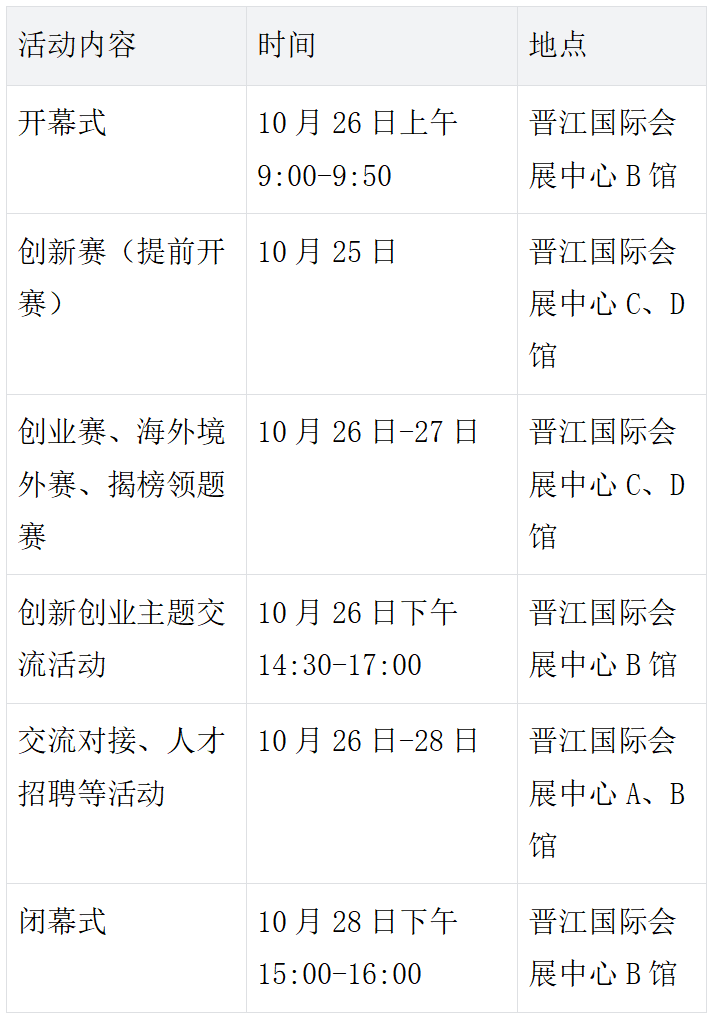 创业赛:10月26日—27日开赛,聚集了不少已经有市场基础的创业项目,既有商业模式创新,又有落地实践,投资者、企业家们,快重点关注,说不定能挖到宝藏项目。