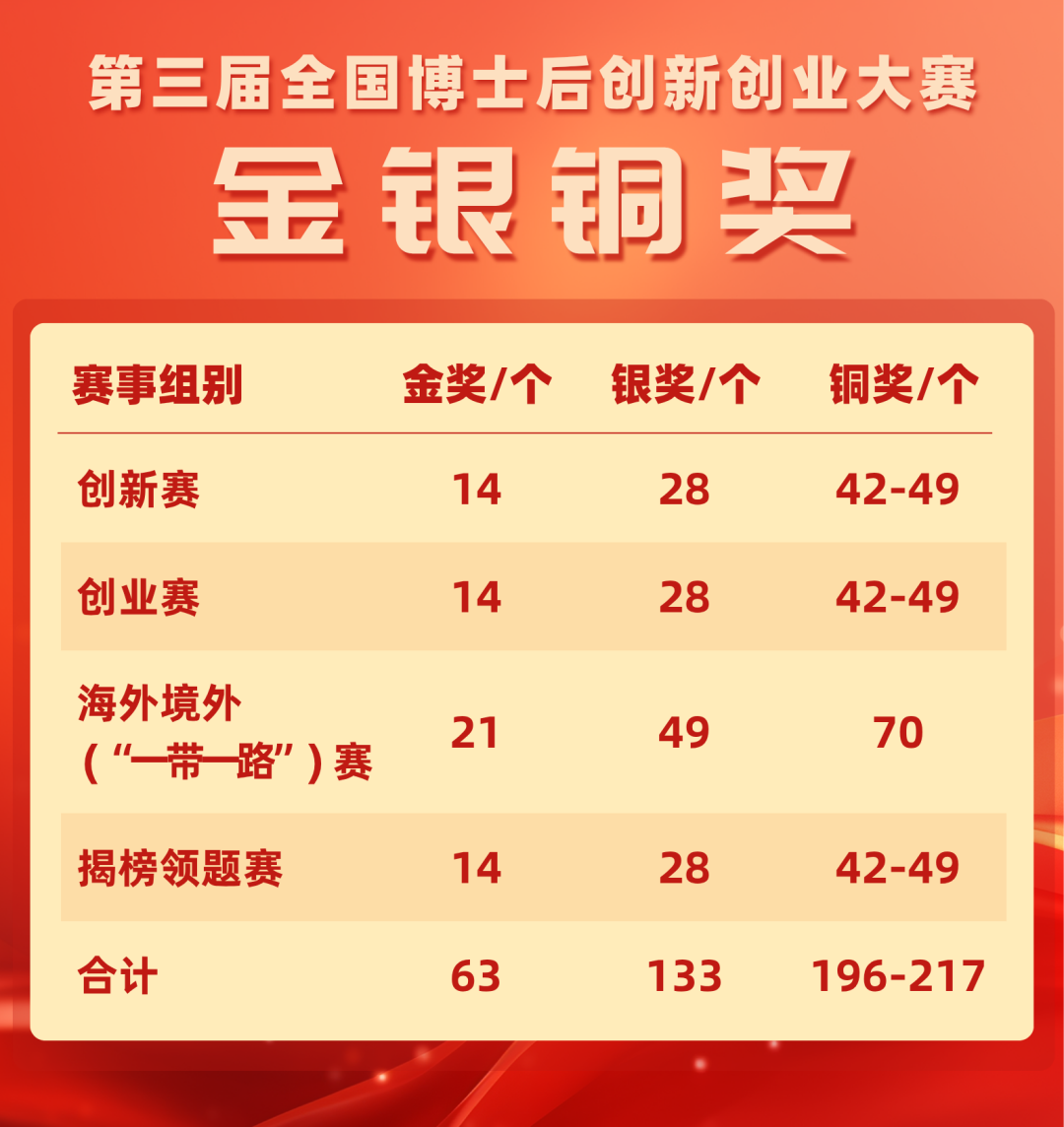 第三届全国博士后创新创业大赛设创新赛、创业赛、海外境外(“一带一路”)赛、揭榜领题赛4个组别,每个组别设新一代信息技术与人工智能、高端装备制造与机器人、新能源与节能环保、新材料与石油化工、生物医药与大健康、现代农业与食品、其他行业等7个赛道,设金奖、银奖、铜奖和优胜奖奖项。对获得金银铜奖的参赛团队颁发奖杯、获奖证书和奖金(其中:金奖10万元、银奖5万元、铜奖2万元),对获得优胜奖的参赛团队颁发获奖证书。