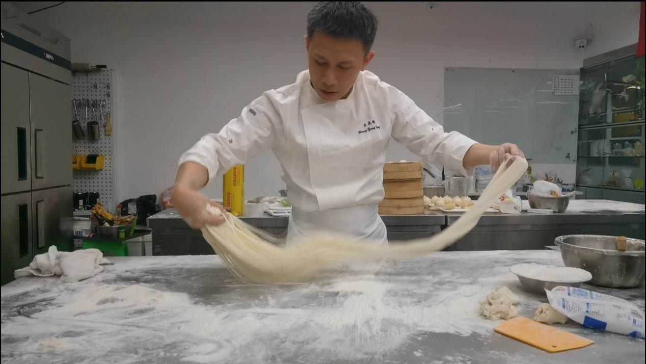 长时间站立让双腿酸得像灌了铅,重复甩面使手臂麻得似有针扎,面粉沾满发梢,汗水浸透工装,但他的眼神始终专注明亮。“面团是有生命的,得用耐心和巧劲让它好好‘绽放’。”他擦汗时笑着说,语气里藏着对技艺的敬畏,更藏着对未来的笃定。