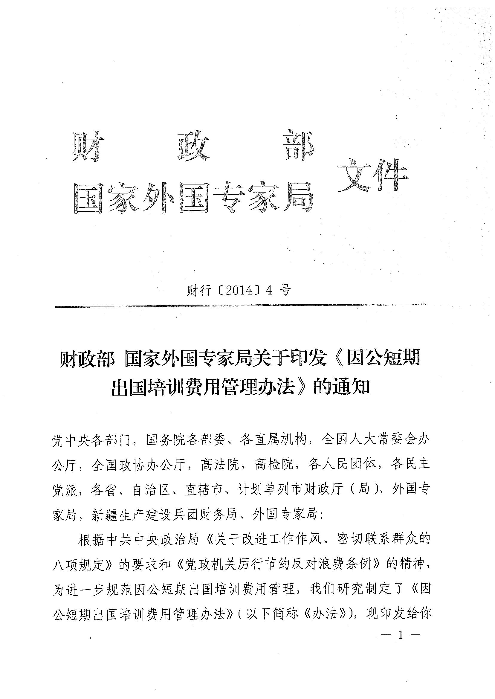 附件:1.财政部 国家外国专家局关于印发《因公短期出国培训费用管理办法》的通知(财行〔2014〕4号)