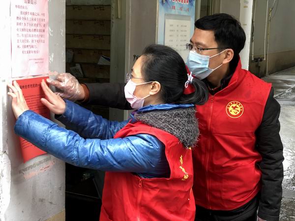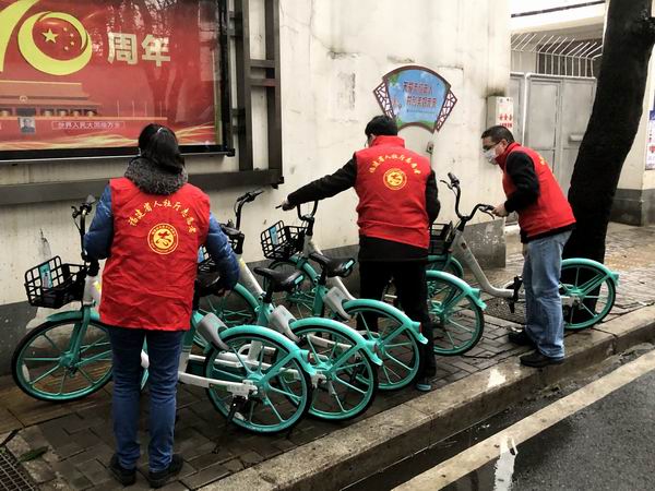2月4日,志愿者们到鼓东街道开元社区协助社区干部开展防控宣传,劝导商户做好防控措施,协助安保人员对往来人员进行体温测量,并帮助整理摆放街道两旁乱停乱放的共享单车,维护社区良好秩序。